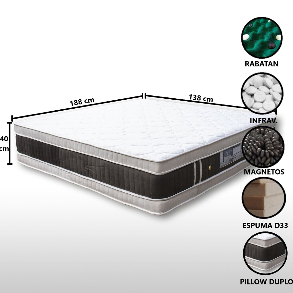 Esse produto contém um colchão magnético premium casal com dois lados (40 cm de altura);