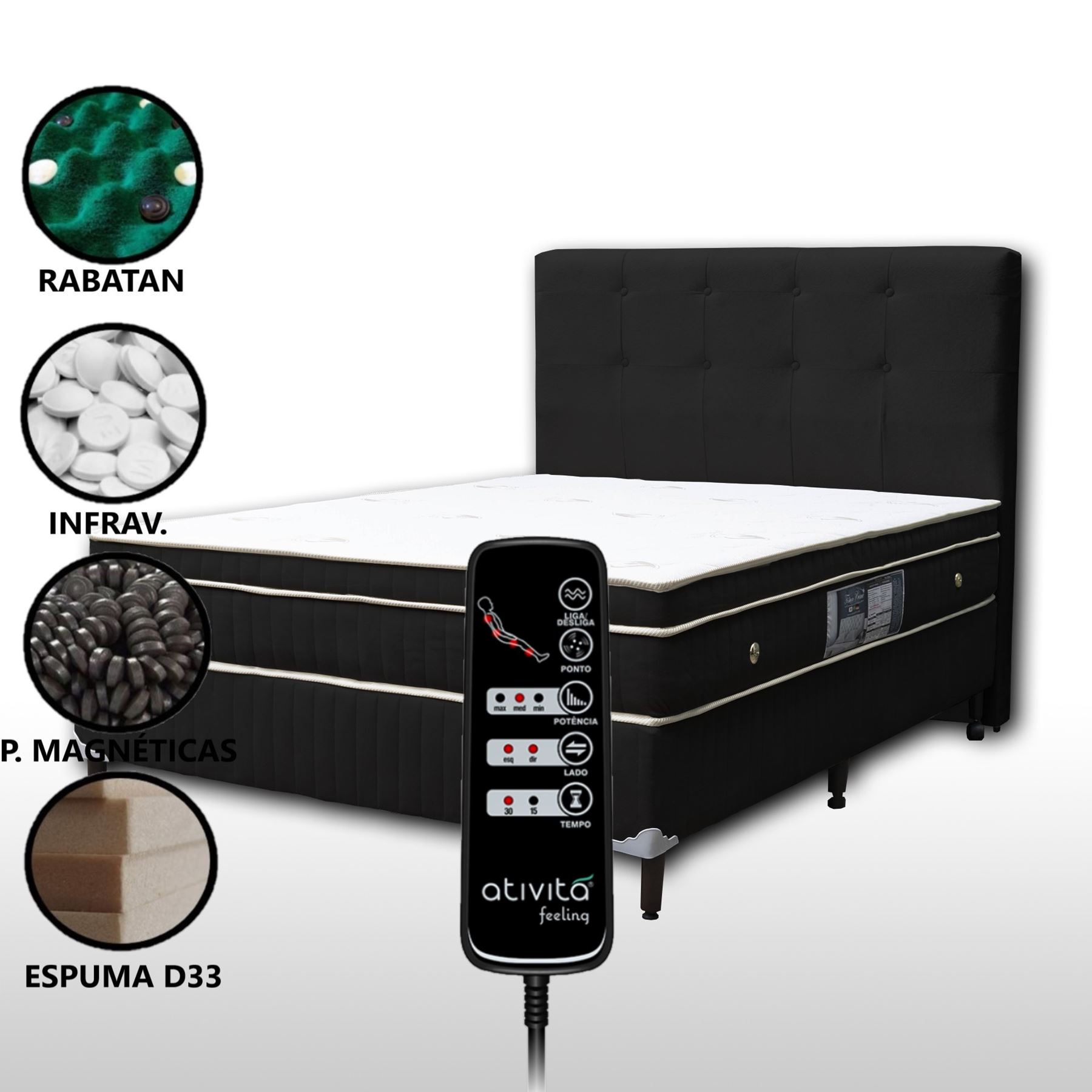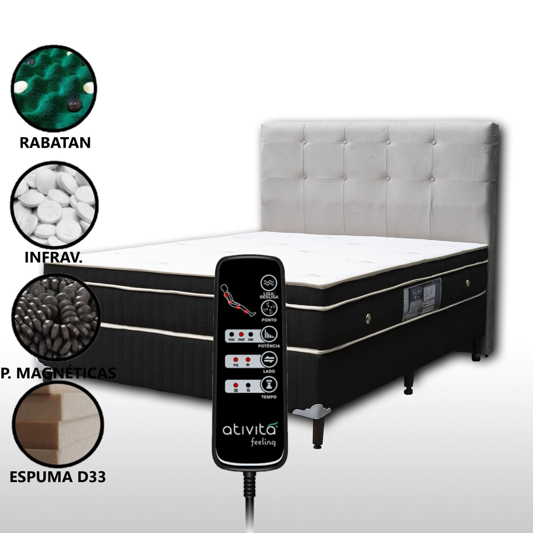 Esse produto contém um colchão magnético casal slim (25 cm de altura) + base box + cabeceira duquesa + kit massageador com 8 motores e controle operacional;