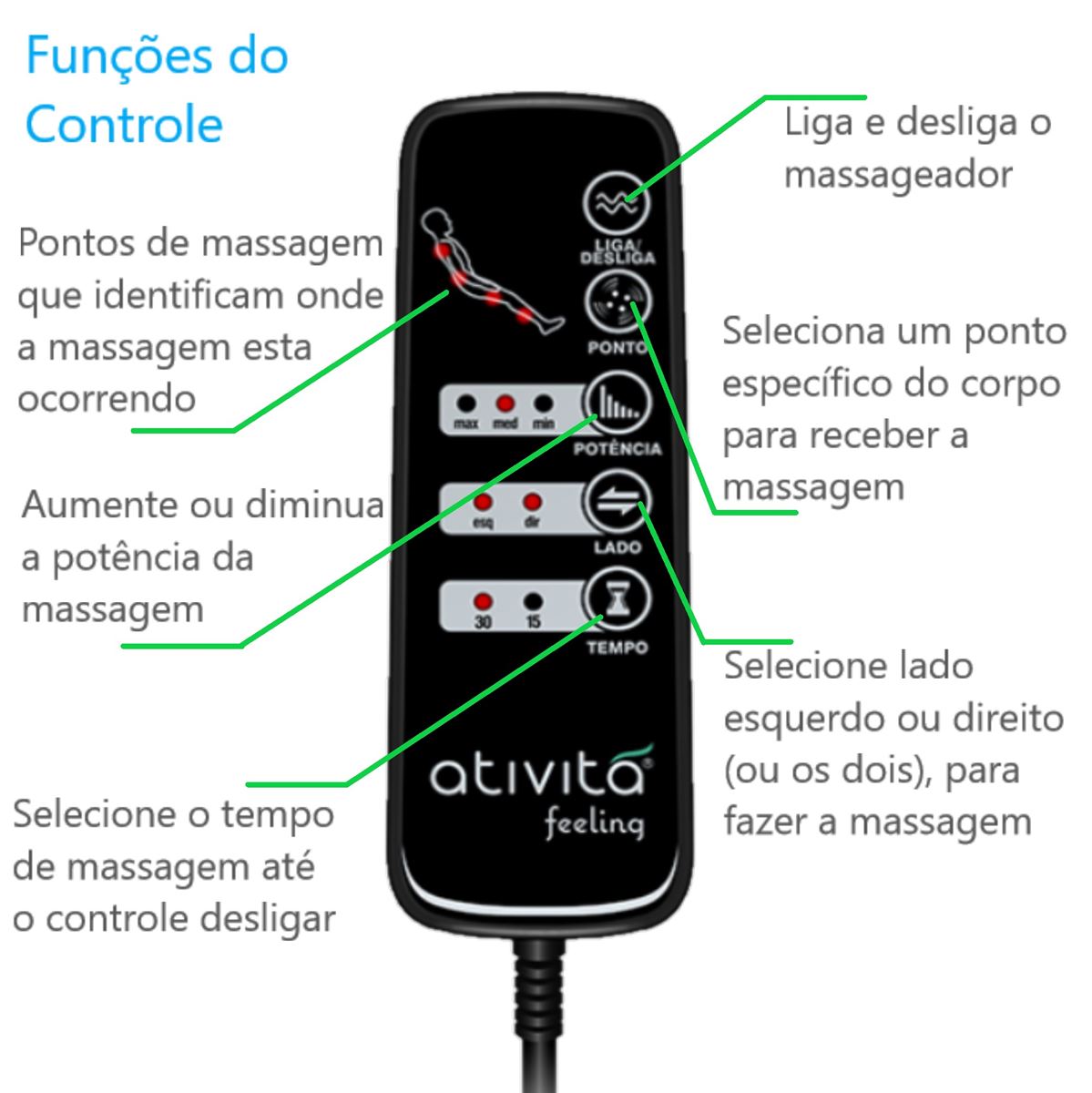 • Funções com regulagens personalizadas conforme necessidade de cada pessoa.
